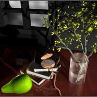 process: each object modeled as a geometric shape, textures applied (from program or google images), light source / cemera set up around scene, full render